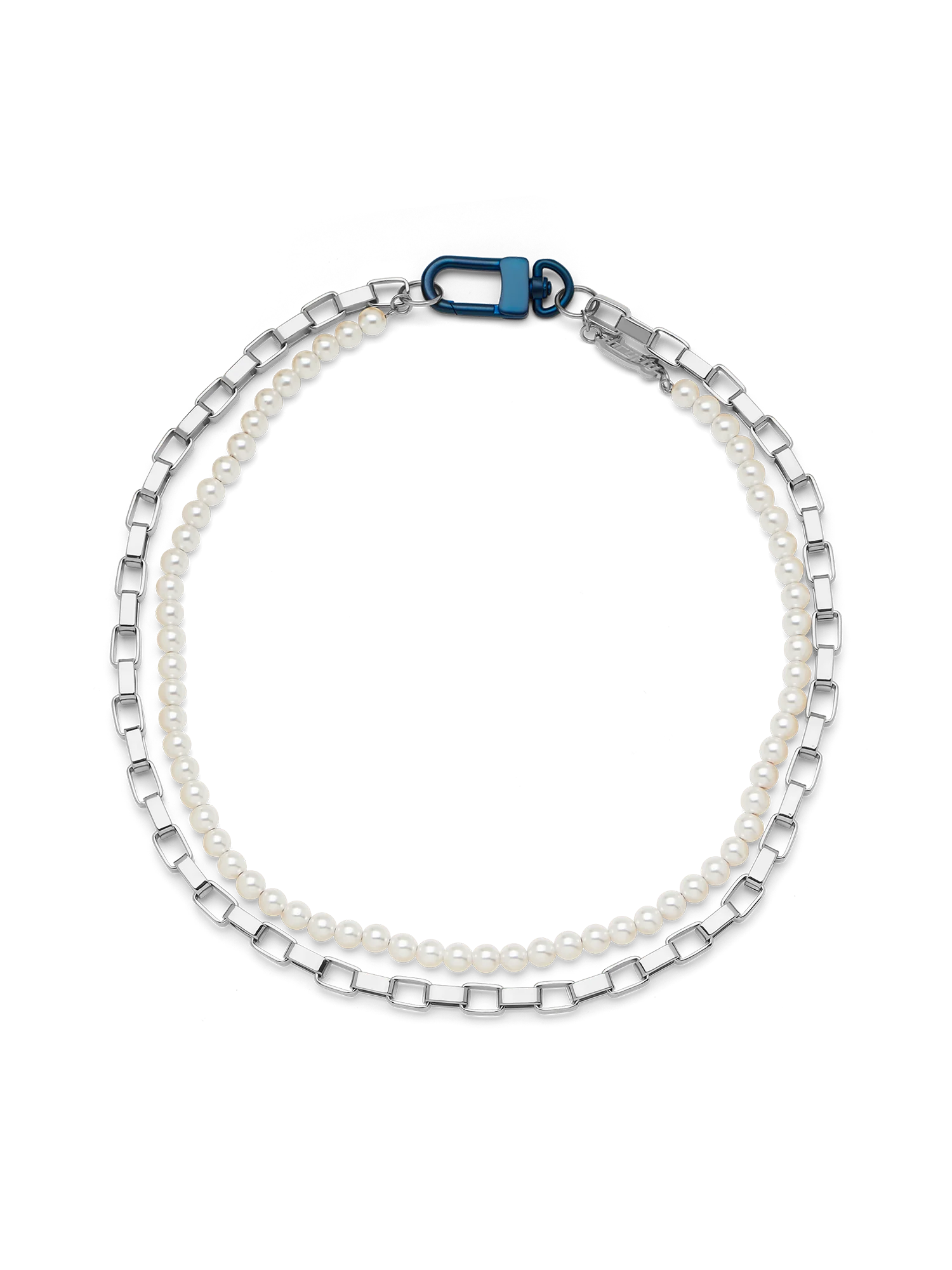 The future is blue. Made with 18" of real freshwater pearls & a 20" square link chain for the perfect stacked look every time. Finished with a bold matte blue clasp, a new Thryfty staple to stand out from the crowd.